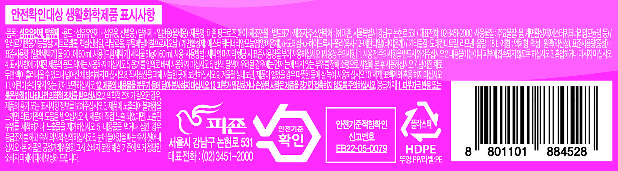 | 품목 및 제품명 | 섬유유연제, 탈취제 / 피죤 핑크로즈_에이 | 용도(표백제의 경우 계열을 함께표시) 및 제형 | 섬유유연제 -섬유용,신발용 / 탈취제 - 일반용(물체용)/ 액체형 |