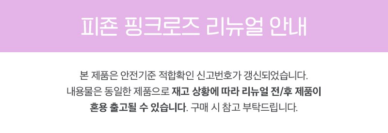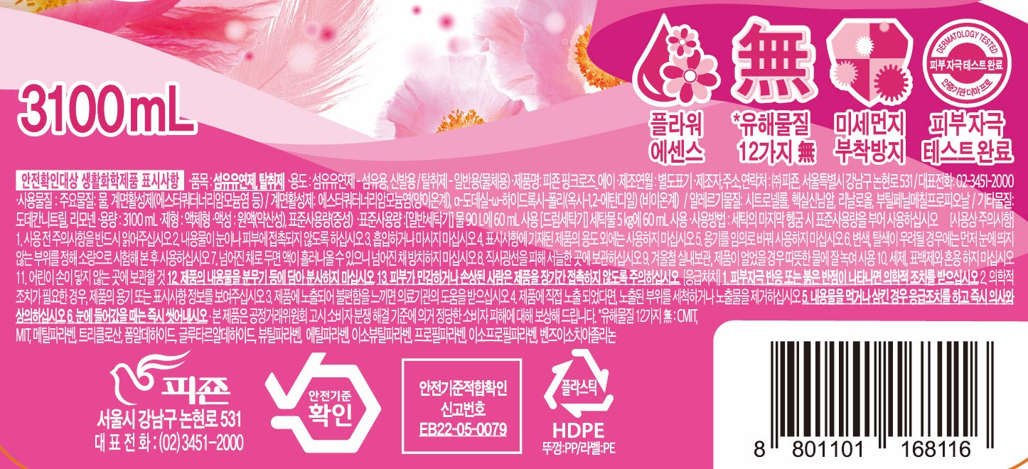 | 품목 및 제품명 | 탈취제,섬유유연제/피죤 핑크로즈_에이 | 용도(표백제의 경우 계열을 함께표시) 및 제형 | 섬유유연제 -섬유용,신발용 / 탈취제 - 일반용(물체용)/ 액체형 |
