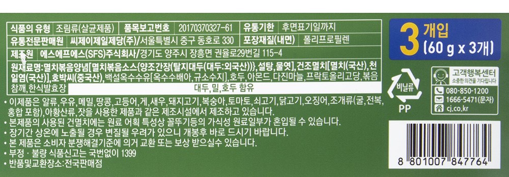 | 제품명 | 비비고 견과류 멸치볶음 | 식품의 유형 | 컨텐츠 참조 |