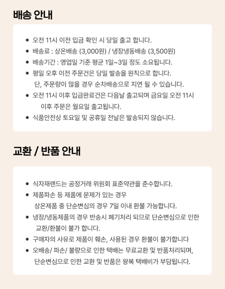 | 배송방법 | 신선/냉장/냉동 | 배송비 | 3,500원 · 도서산간 추가 배송비 - 제주 지역: 3,000원 - 도서산간 지역: 5,000원 |