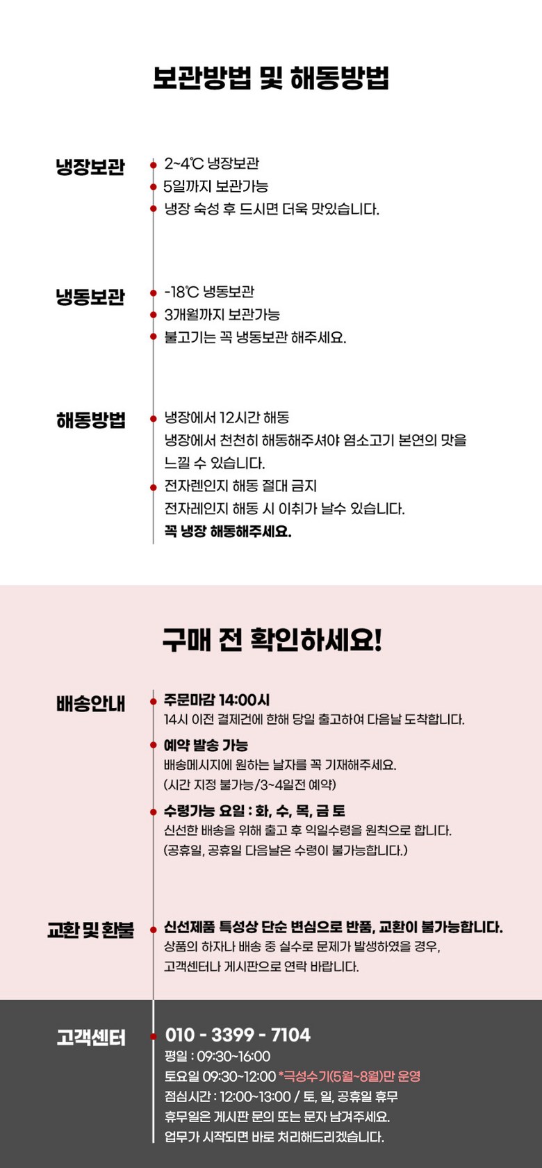 | 배송방법 | 신선/냉장/냉동 | 배송비 | 4,000원 - 170,000원 이상 구매 시 무료배송 · 도서산간 추가 배송비 - 제주 지역: 3,000원 - 도서산간 지역: 5,000원 |