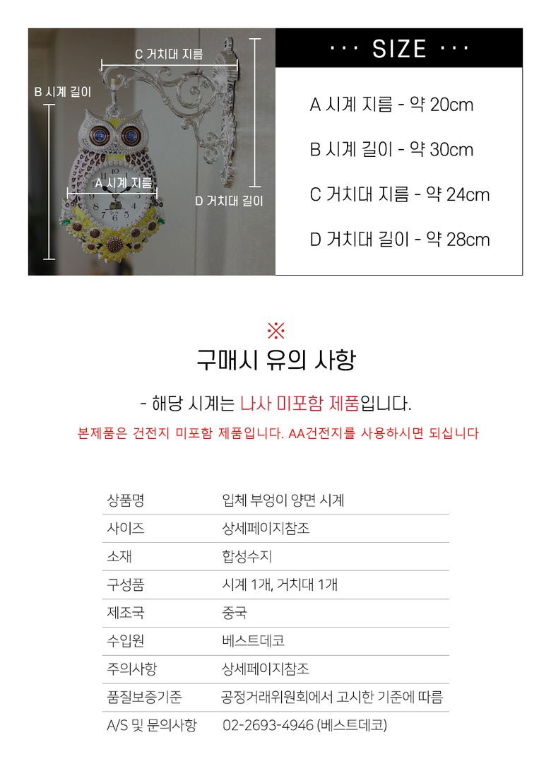 | 품명 및 모델명 | 베스트데코 입체 부엉이 양면 시계 | 인증/허가 사항 | 해당없음 |