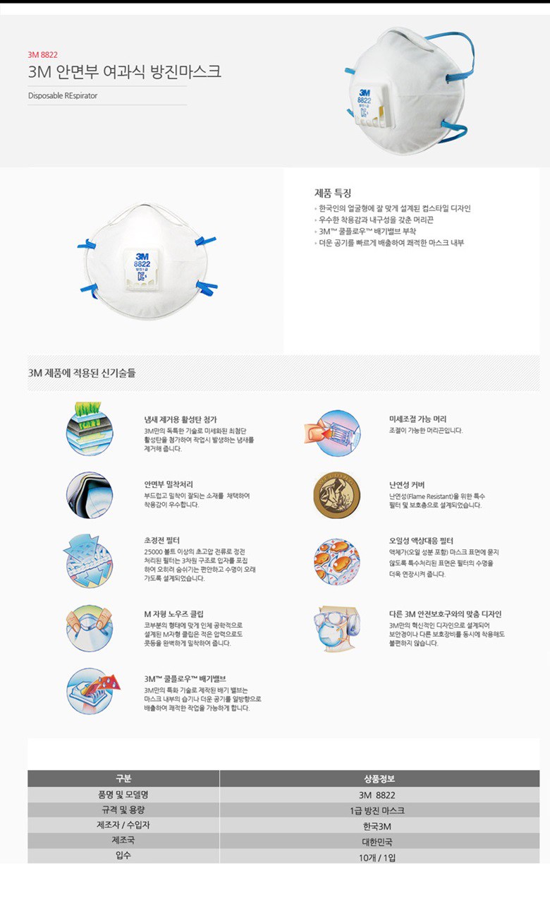 | 품명 및 모델명 | 3M 1급 방진마스크 8822 | 인증/허가 사항 | 안면부여과식, 1급 / 10-AV4CT-0345 |