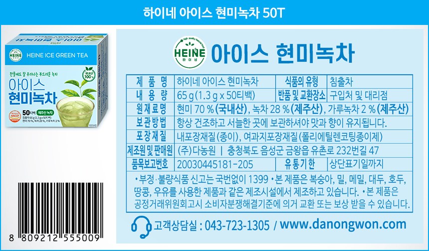 | 제품명 | 하이네 아이스 현미녹차 | 식품의 유형 | 침출차 |