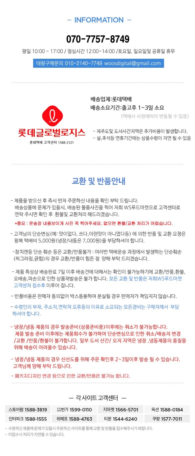 - ㆍ교환/반품에 관한 일반적인 사항은 판매자가 제시사항보다 관계법령이 우선합니다.