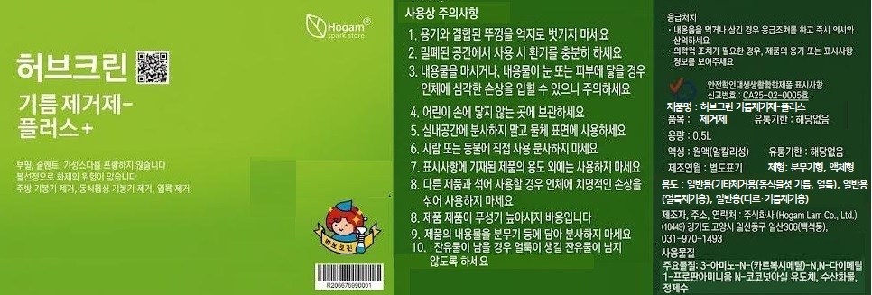 | 품목 및 제품명 | 제거제 / 허브크린 기름제거제-플러스 | 용도(표백제의 경우 계열을 함께표시) 및 제형 | 일반용(기타제거용(동식물성 기름, 얼룩), 일반용(얼룩제거용), 일반용(타르·기름 제거용) / 분무기형, 액체형 |
