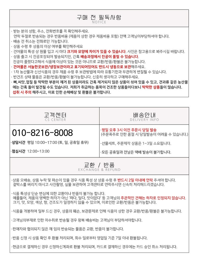 - ㆍ모니터 해상도의 차이로 인해 색상이나 이미지가 실제와 달라, 고객이 단순 변심으로 교환/반품을 무료로 요청하는 경우