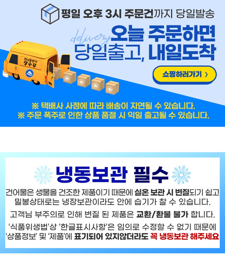 | 배송방법 | 신선/냉장/냉동 | 배송비 | 무료배송 · 도서산간 추가 배송비 - 제주 지역: 3,000원 - 도서산간 지역: 5,000원 |