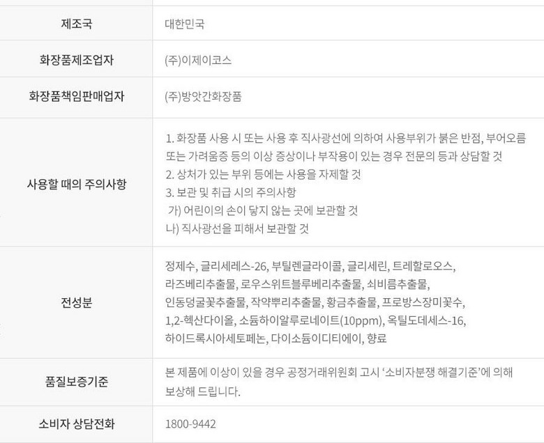 | 화장품제조업자, 화장품책임판매업자 및 맞춤형화장품판매업자 | 상품 상세페이지 참조 | 제조국 | 상품 상세페이지 참조 |