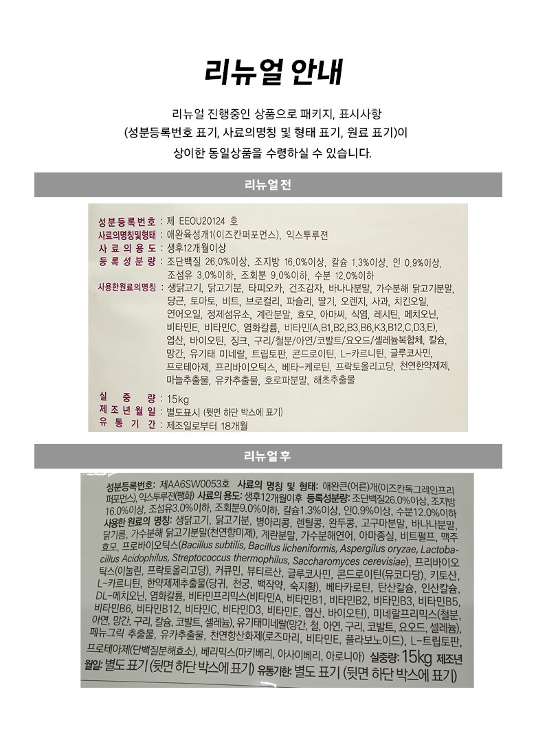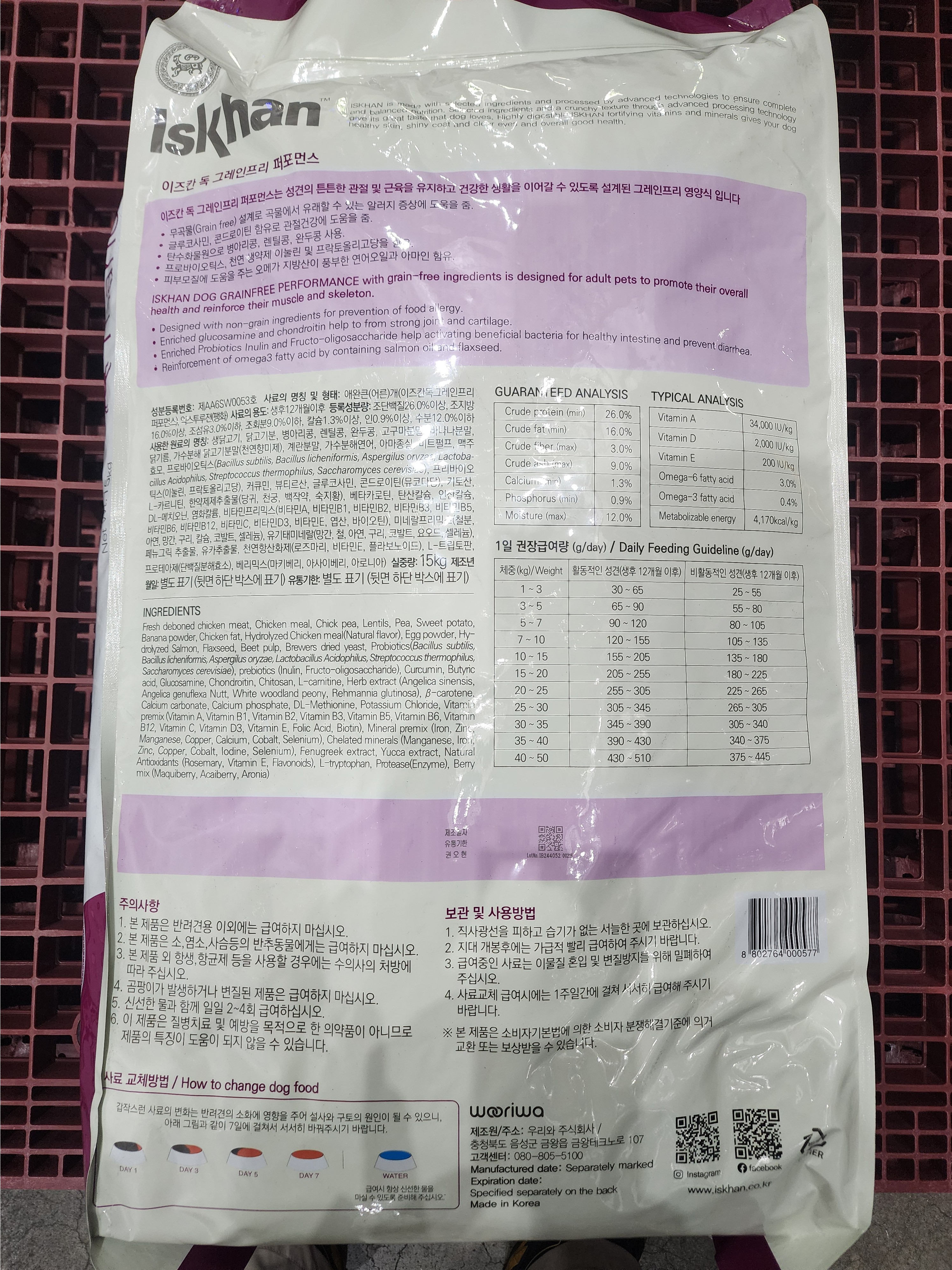 | 품명 및 모델명 | 이즈칸 독 그레인프리 퍼포먼스 | 인증/허가 사항 | 사료관리법에 따른 성분등록번호 : 컨텐츠 참조 |
