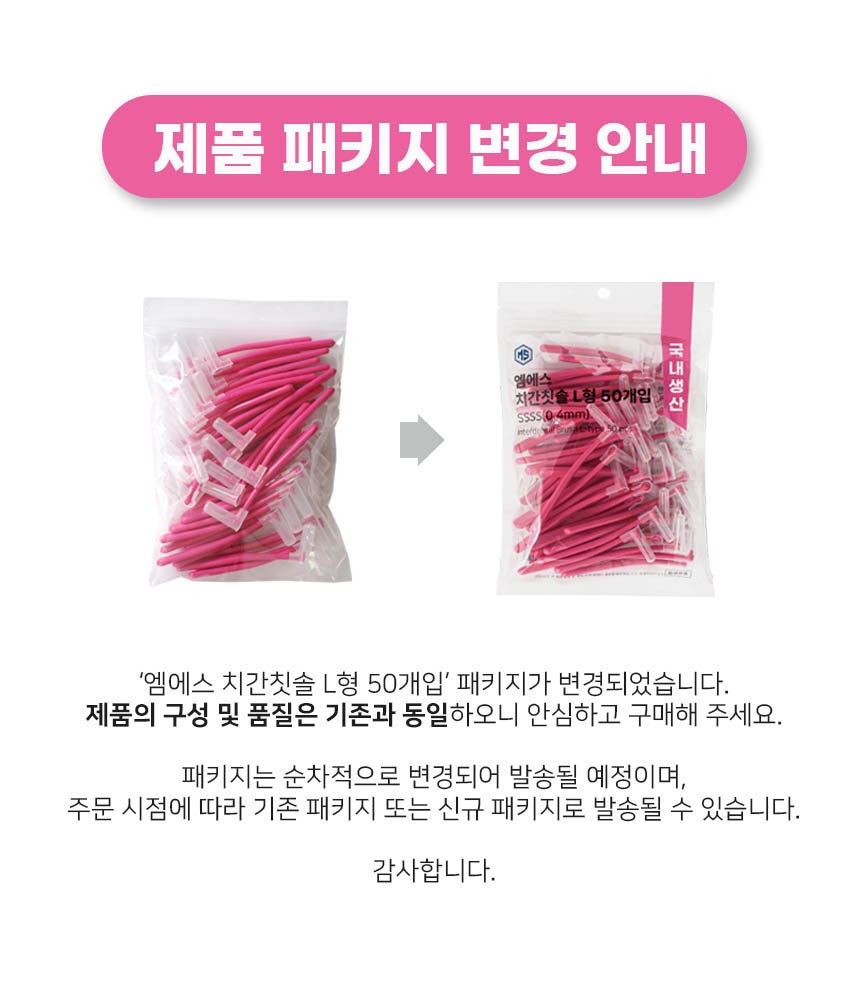 | 품명 및 모델명 | 리뉴얼 전: 치간칫솔 L형 50P SSSS(0.4mm) / 리뉴얼 후: 엠에스 치간칫솔 L형 | 인증/허가 사항 | 리뉴얼 전: 해당없음(14세이상) / 리뉴얼 후: 위생용품 |