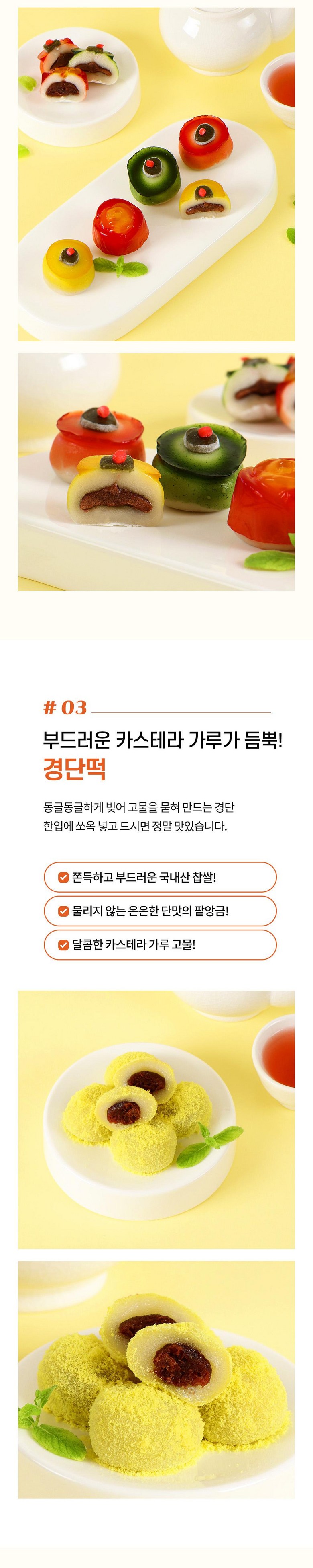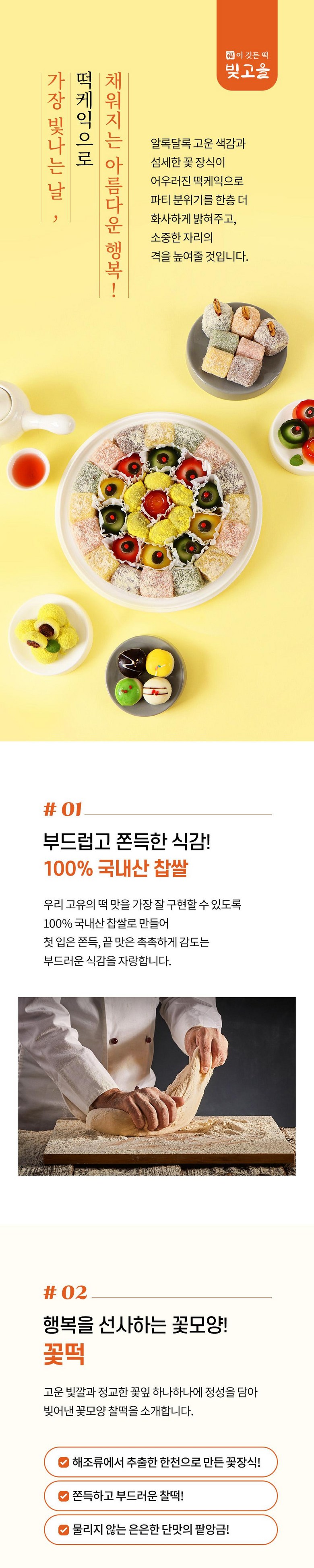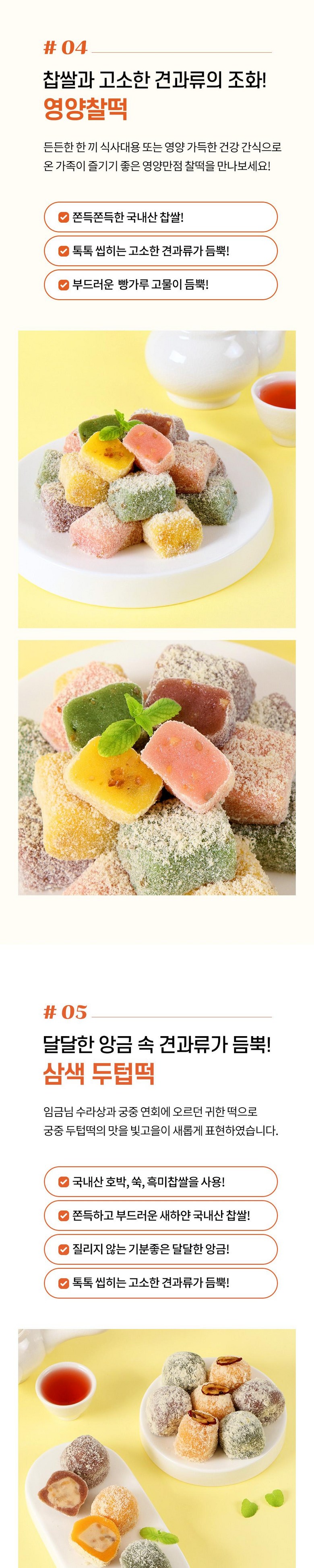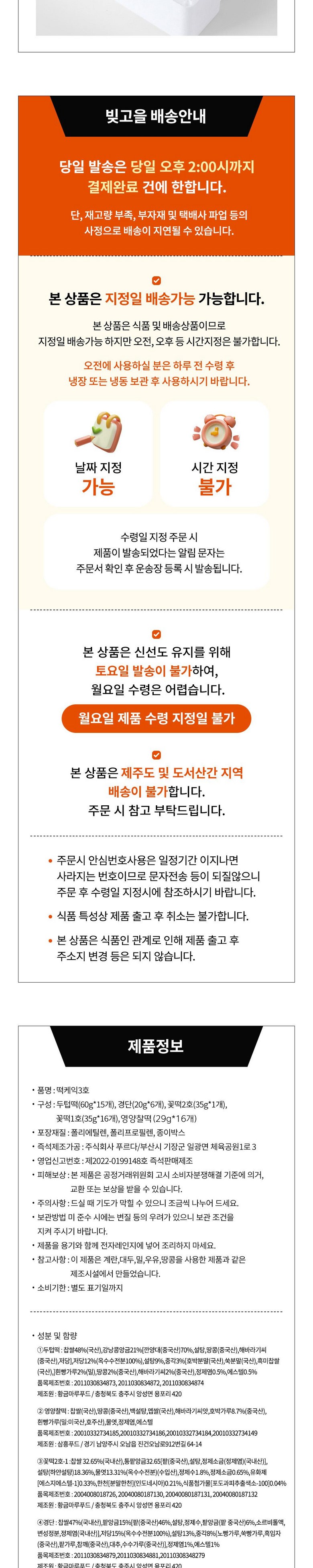 | 생산자 및 소재지 | 두텁떡 : <진우푸드> 경기도 수원시 영통구 매탄동 41-3영양찰떡, 말이떡 : <누리식품> 경기도 화성시 향납음 구문천리 248-36꽃찹쌀떡, 초코찹쌀떡 : <황금마루> 서울 구로구 궁동 278-6 | 제조연월일, 소비기한 또는 품질유지기한 | 제조일자 : 주문 확인 후 순차적 생산유통기한 : 상온 (서늘한 곳에서만 보관 시) 5~7일까지, 냉장보관 시 2주정도까지, 냉동보관 시 케익 박스 밑면 표기된 기한까지 |