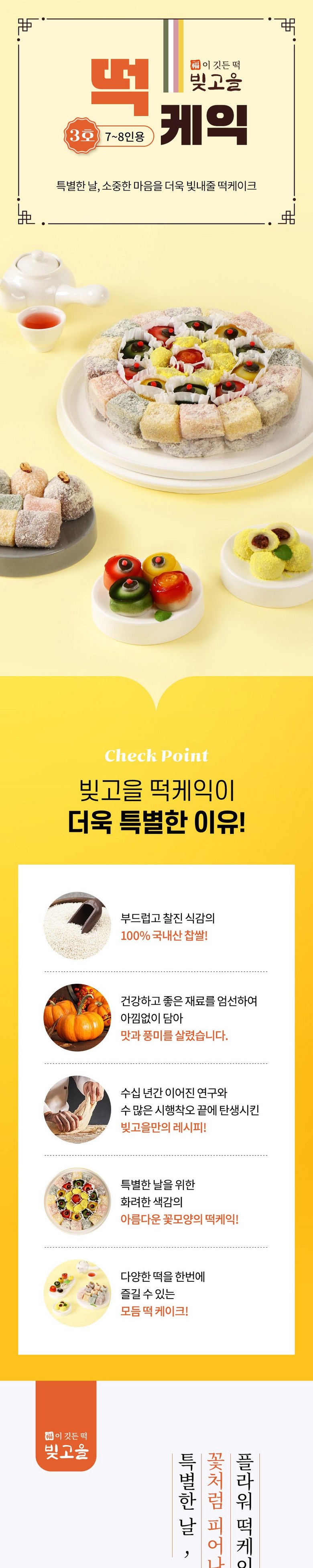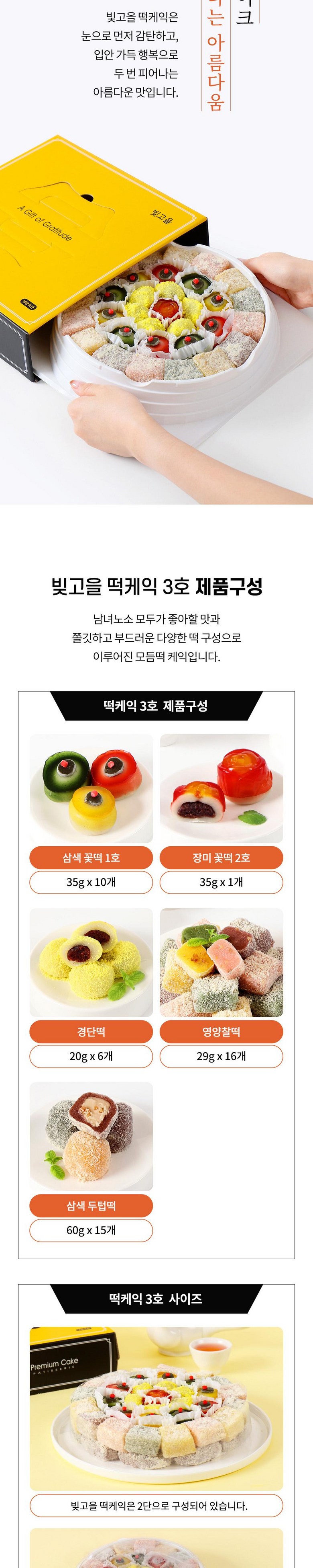 | 포장단위별 내용물의 용량(중량), 수량 | 떡케익3호 : 두텁떡(60g*15개), 영양찰떡(30g*16개), 경단(20g*6개), 대추경단(20g*11개), 꽃떡(35g*1개) / 지름21cm 높이 약 5-8cm / 약 1775g | 원재료명 및 함량 | ⦁두텁떡 : 찹쌀(48%-국산), 강낭콩앙금(21%-중국산), 솔비톨(12%), 정백당(9%), 흑미두텁(흑미찹쌀3%-국산), 쑥두텁(쑥분말3%-국산), 호박두텁(호박분말3%-국산)⦁경단 : 찹쌀(47%-국산), 팥앙금(15%-중국산), 솔비톨(15%), 정백당(13%), 대추(중국산)⦁영양찰떡 : 찹쌀(39%-국산), 물엿13%(옥수수전분100%), 찰옥수수전분(12%-수입산), 정백당 (7%), 땅콩(10%-중국산), 코코넛슬라이스(5%), 아몬드슬라이스(5%), 해바라기씨(3%-중국산), (호박분말, 쑥분말, 백년초분말, 흑미찹쌀)각1%⦁꽃찹쌀떡 : 찹쌀(60%-국내산), 팥앙금(20%-중국산), 설탕(10%), 정제염, 에스텔, 물엿, 한천, 정수 |