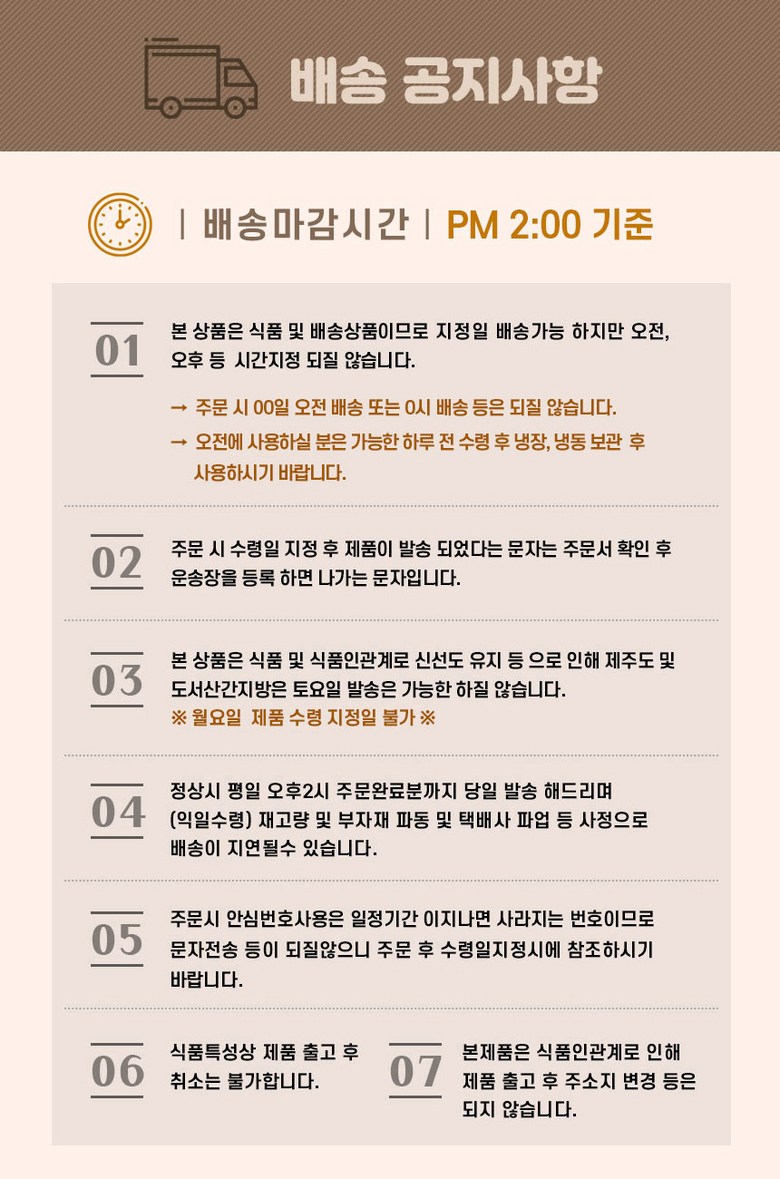 | 배송방법 | 신선/냉장/냉동 | 배송비 | 무료배송 - 도서산간 지역 배송불가 |