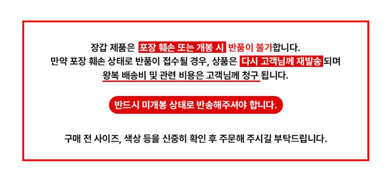 - ㆍ모니터 해상도의 차이로 인해 색상이나 이미지가 실제와 달라, 고객이 단순 변심으로 교환/반품을 무료로 요청하는 경우
