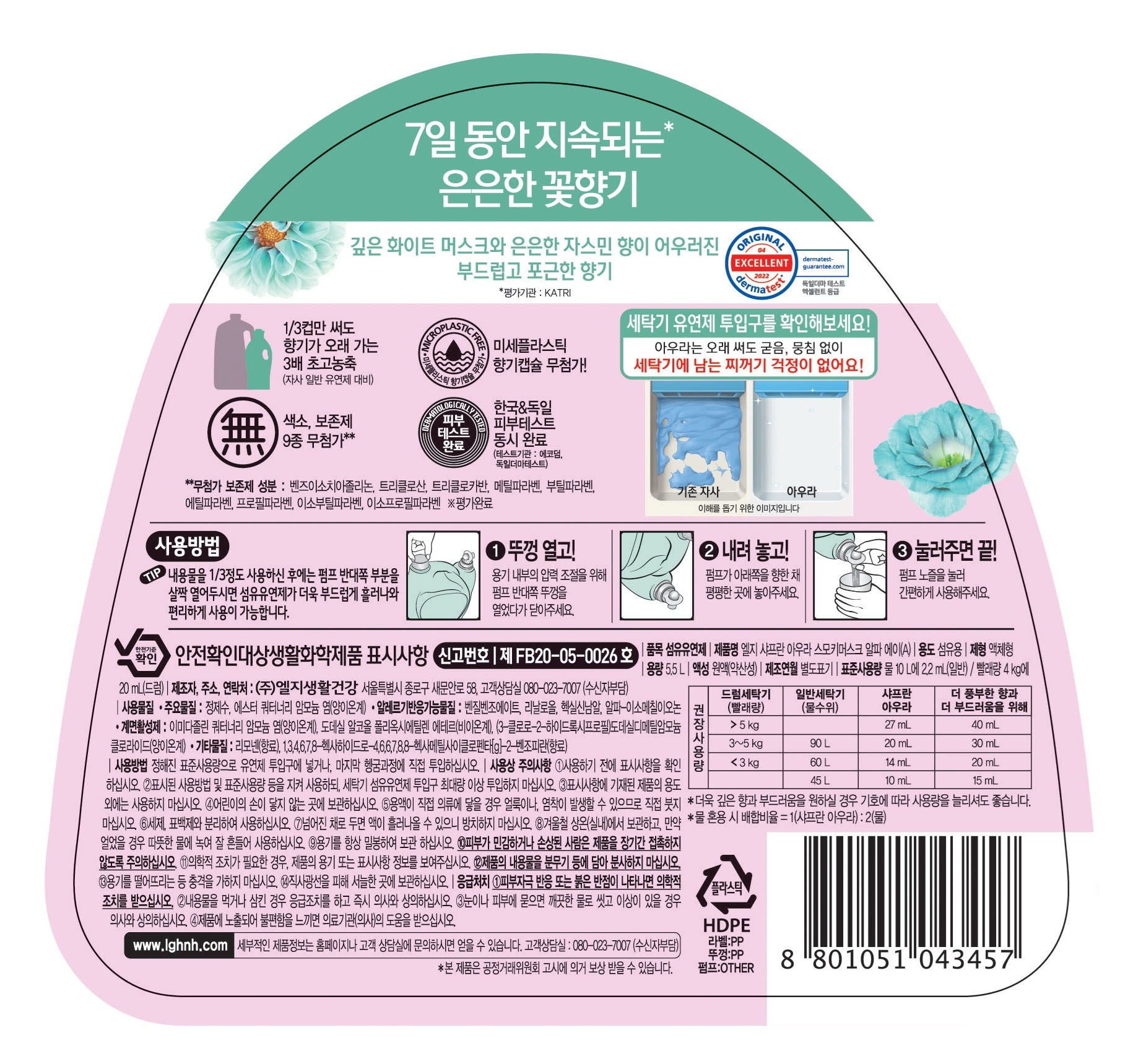 | 품목 및 제품명 | 섬유유연제 / 엘지 샤프란 아우라 스모키머스크 알파 에이(A) | 용도(표백제의 경우 계열을 함께표시) 및 제형 | 섬유용 / 비분사형-액체형 |