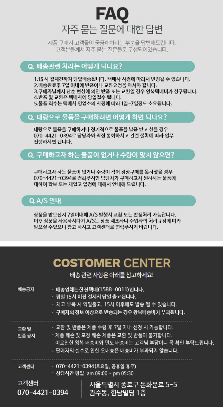 - ㆍ모니터 해상도의 차이로 인해 색상이나 이미지가 실제와 달라, 고객이 단순 변심으로 교환/반품을 무료로 요청하는 경우