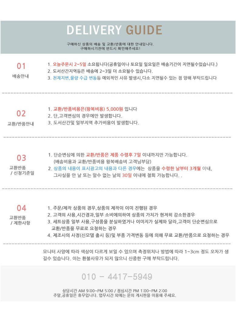 - ㆍ모니터 해상도의 차이로 인해 색상이나 이미지가 실제와 달라, 고객이 단순 변심으로 교환/반품을 무료로 요청하는 경우