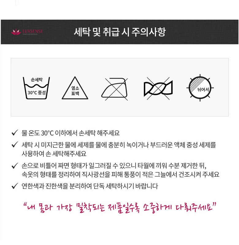 | 제조국 | 대한민국 | 세탁방법 및 취급시 주의사항 | 30도이하 물로 중성세제사용하여 단독세탁해주세요.손으로 비틀어짜면 변형될 수도 있습니다 |