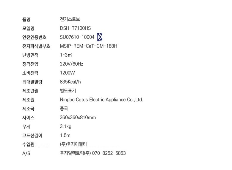 | 품명 및 모델명 | 전기스토브 DSH-T7100HS | KC 인증정보 | SU07610-10004J, MSIP-REM-CeT-CM-188H |