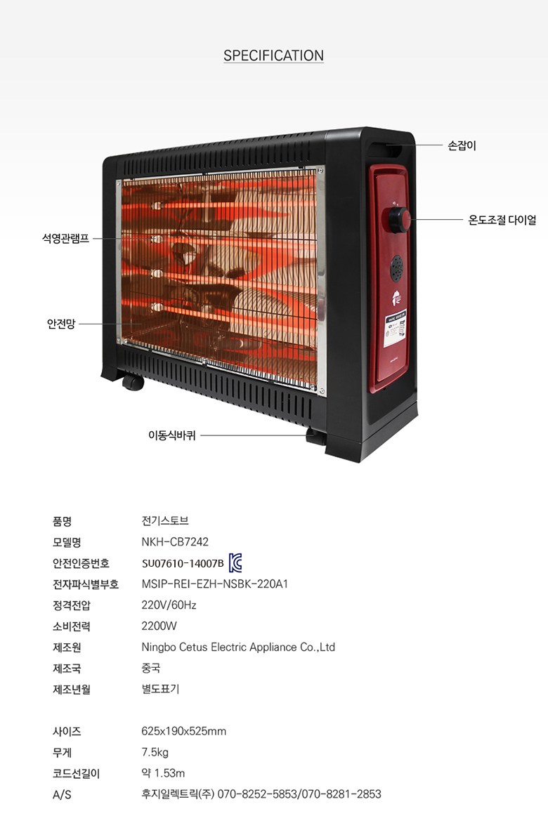 | 품명 및 모델명 | 전기스토브 NKH-CB7242 | KC 인증정보 | SU07610-14007B / MSIP-REI-EZH-NSBK-220A1 |