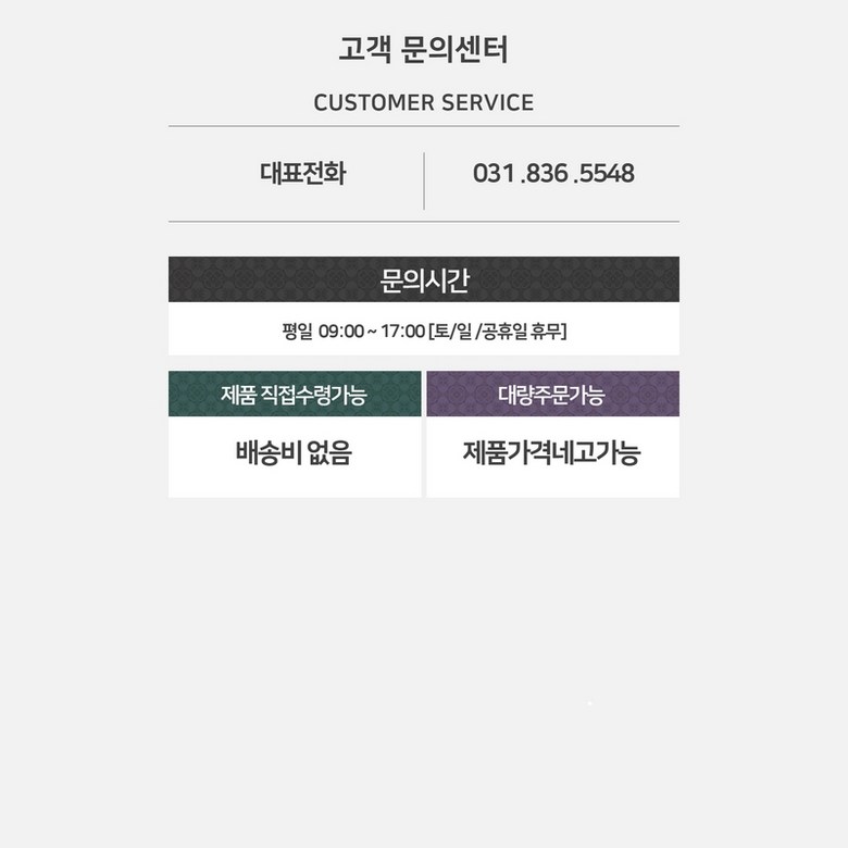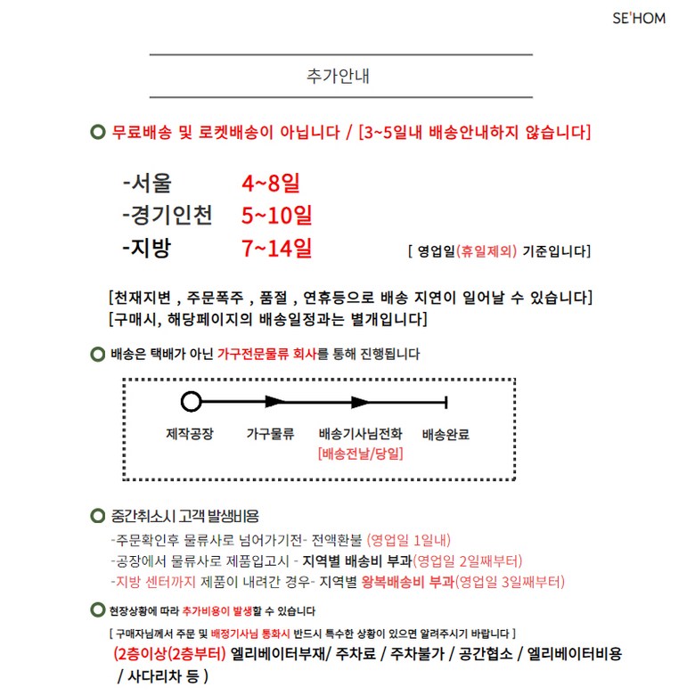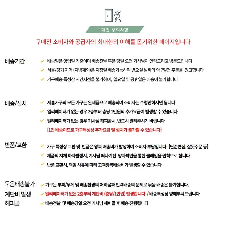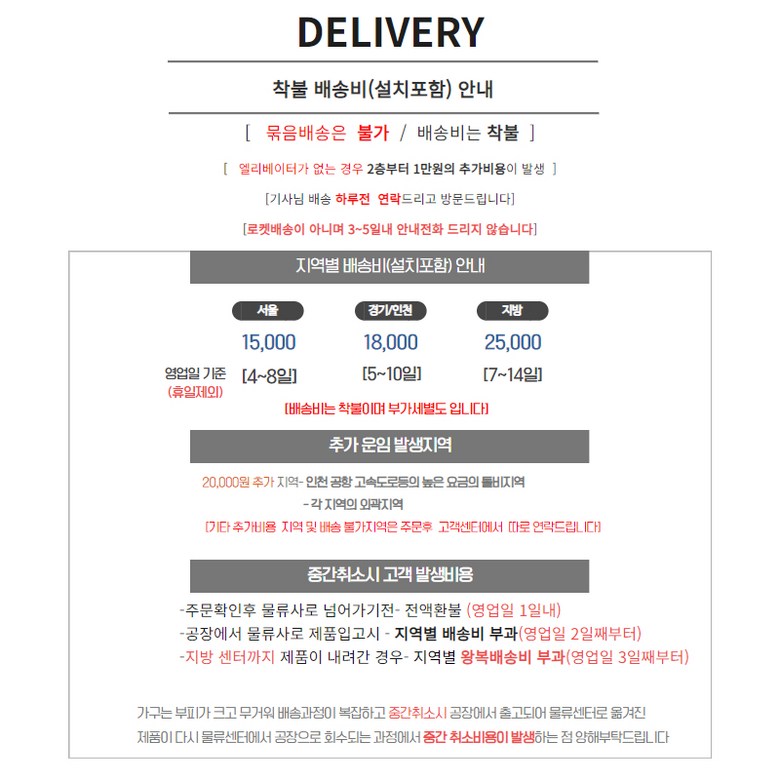 | 배송방법 | 업체직송 | 배송비 | 착불배송(상품별 배송비, 배송가능지역은 상세페이지 참조) - 도서산간 지역 배송불가 |
