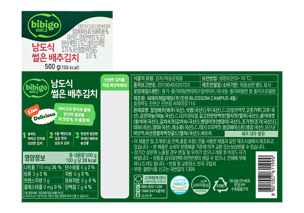| 제품명 | CJ제일제당 비비고 더풍부한 맛 썰은배추김치 용기 | 식품의 유형 | 컨텐츠 참조 |