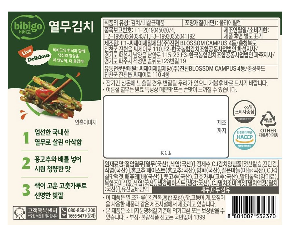 | 제품명 | 비비고 열무김치 | 식품의 유형 | 컨텐츠 참조 |
