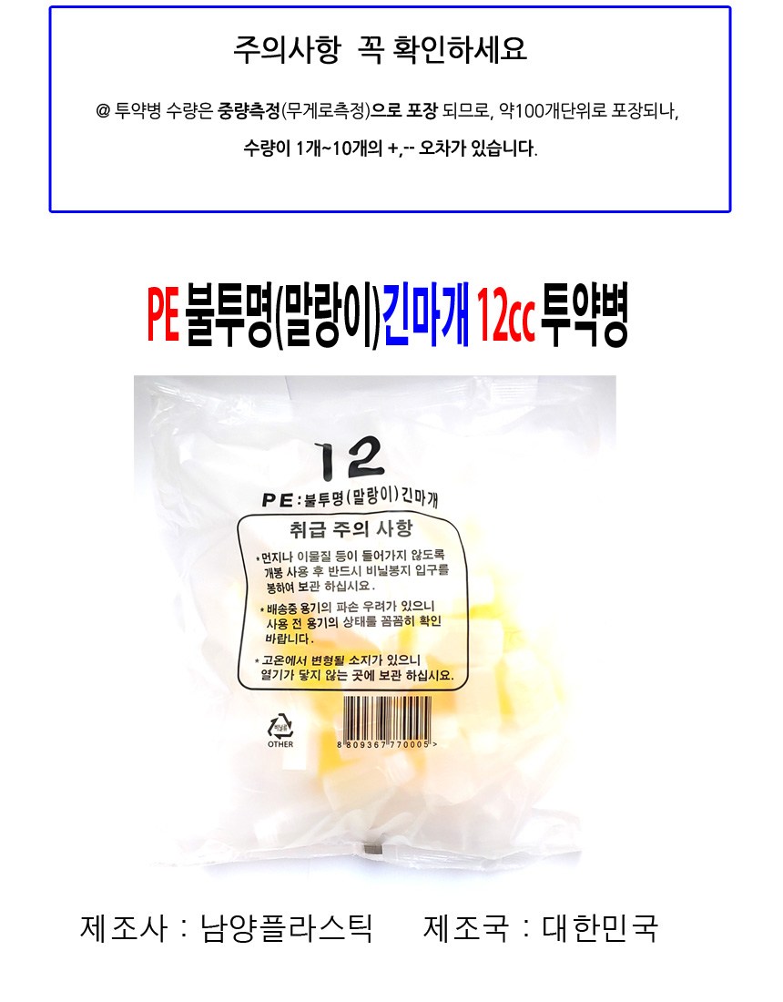 | 품명 및 모델명 | 남양 PE투약병12cc | 인증/허가 사항 | 해당없음 |