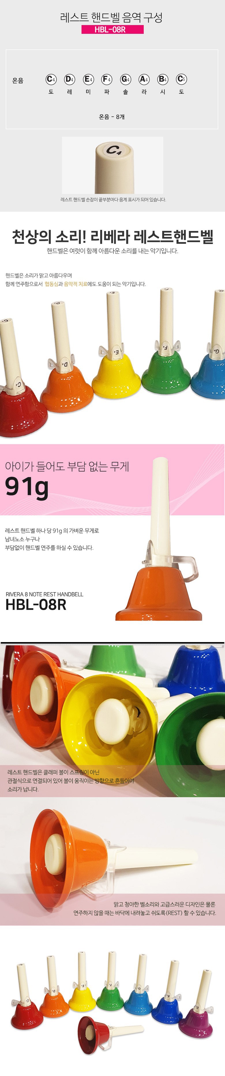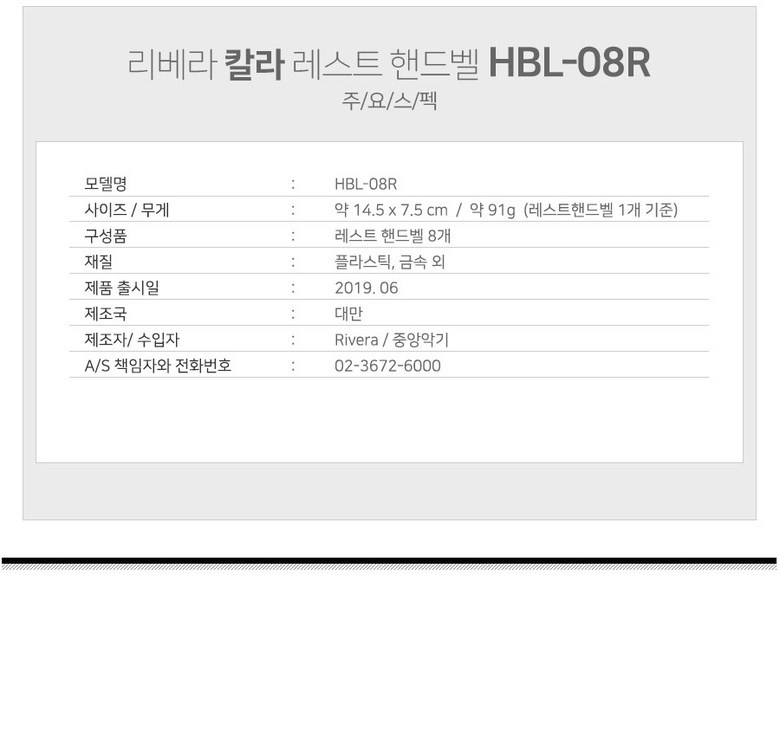 | 품명 및 모델명 | 리베라 8음 칼라 레스트핸드벨 HBL-08R | 크기 | 컨텐츠참조 |