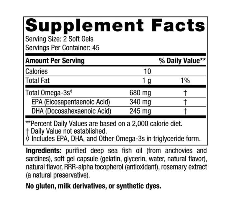 오메가-3 성분이 함유된 식이 보조제입니다. 1인분 당 EPA 340mg, DHA 245mg를 제공합니다. D-alpha 토코페롤, 로즈메리 추출물, 정제된 심해 어유 등이 함유되어 있습니다.