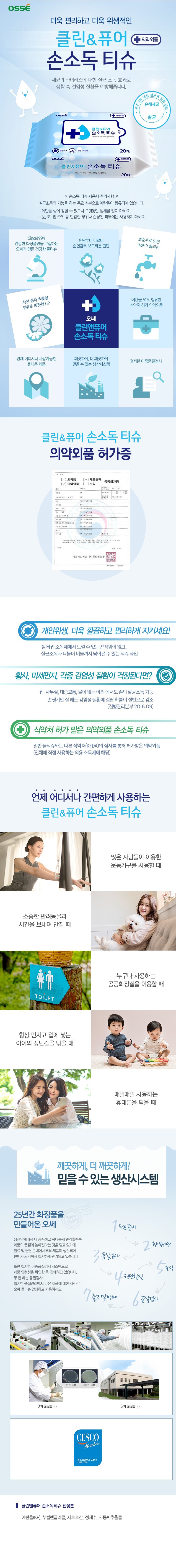 | 품명 및 모델명 | 오쎄 클린앤 퓨어 손소독티슈 | 인증/허가 사항 | 의약외품 |