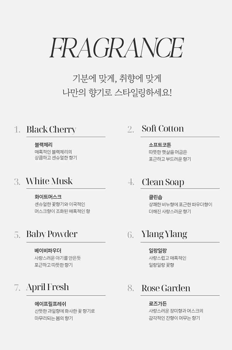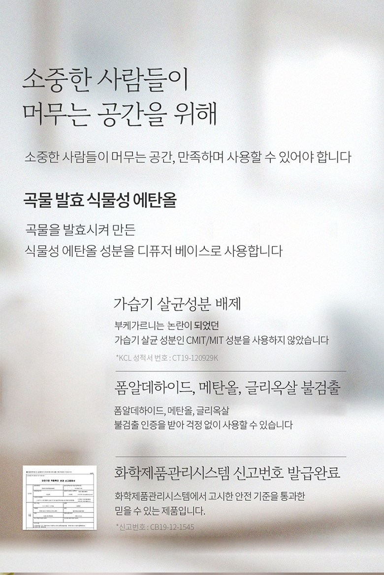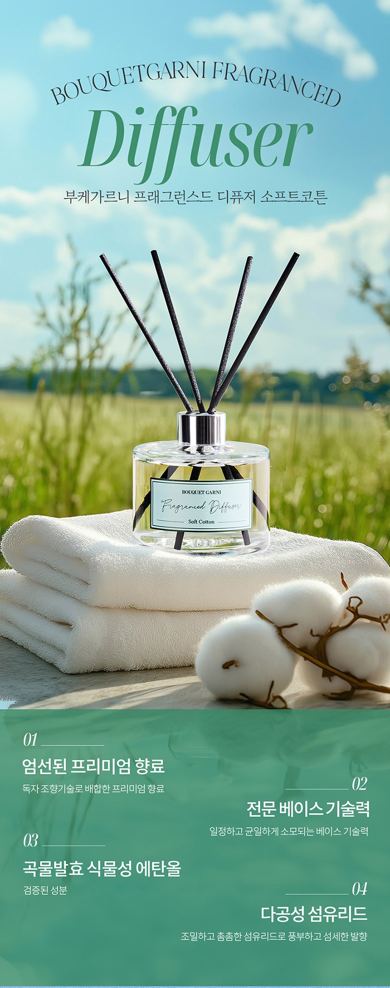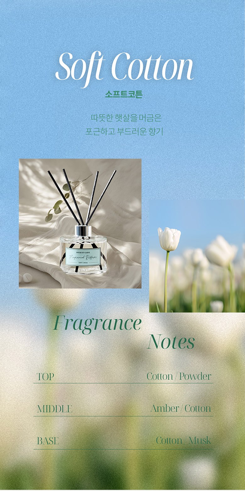 | 품목 및 제품명 | 방향제 / 부케가르니 디퓨저(소프트코튼) | 용도(표백제의 경우 계열을 함께표시) 및 제형 | 일반용-실내공간용 / 액체형 |