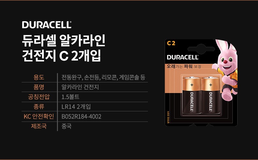 | 품명 및 모델명 | 듀라셀 알카라인 건전지 C / LR14 | 인증/허가 사항 | B052R184-4002 |