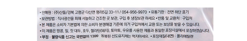 | 생산자(수입자) | ㈜산들 / 경북 고령군 다산면 좌학길 57 | 원산지 | 컨텐츠 참조 |