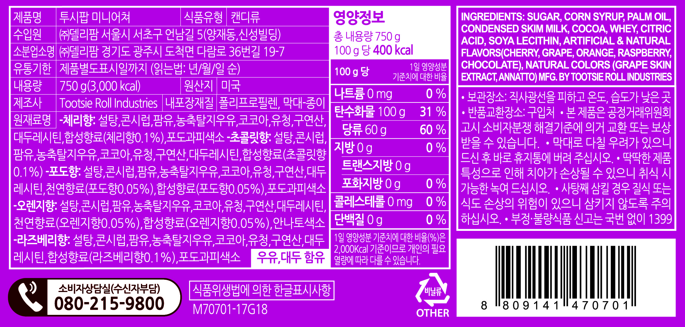 | 제품명 | 투시팝 미니어쳐 | 식품의 유형 | 캔디류 |