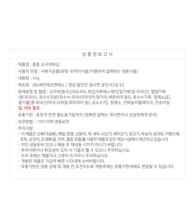 | 생산자 및 소재지 | 상세설명 별도표시 | 제조연월일, 소비기한 또는 품질유지기한 | 상세설명 별도표시 |