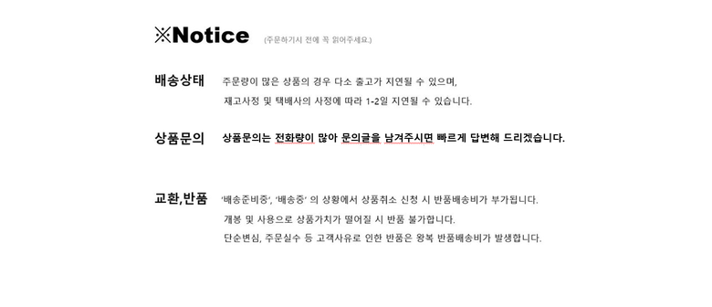 | 배송기간 | ㆍ도서산간 지역 등은 배송에 3-5일이 더 소요될 수 있습니다. - 천재지변, 물량 수급 변동 등 예외적인 사유 발생 시, 다소 지연될 수 있는 점 양해 부탁드립니다. | ||