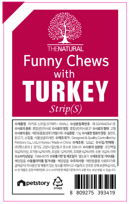 | 품명 및 모델명 | 터키츄 스트립(STRIP) | 인증/허가 사항 | 사료관리법에 따른 성분등록번호 : 컨텐츠 참조 |