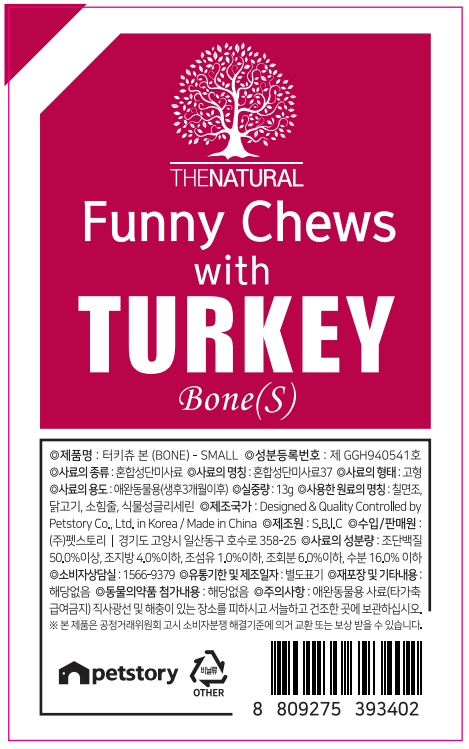 | 품명 및 모델명 | 터키츄 본(BONE) - SMALL | 인증/허가 사항 | 사료관리법에 따른 성분등록번호 : 컨텐츠 참조 |