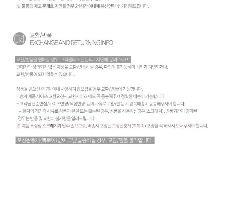 - ㆍ교환/반품에 관한 일반적인 사항은 판매자가 제시사항보다 관계법령이 우선합니다.
