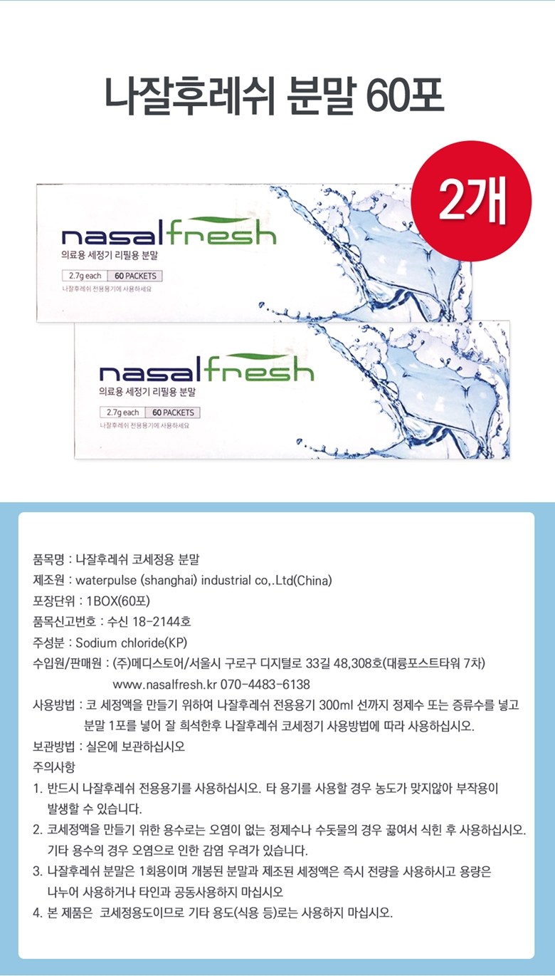 | 품명 및 모델명 | 의료용세정기/나잘후레쉬 코세정용 분말 | 허가∙인증∙신고번호 (의료기기법에 따른 허가∙인증∙신고 대상 의료기기에 한함) | 수신18-2144호 |