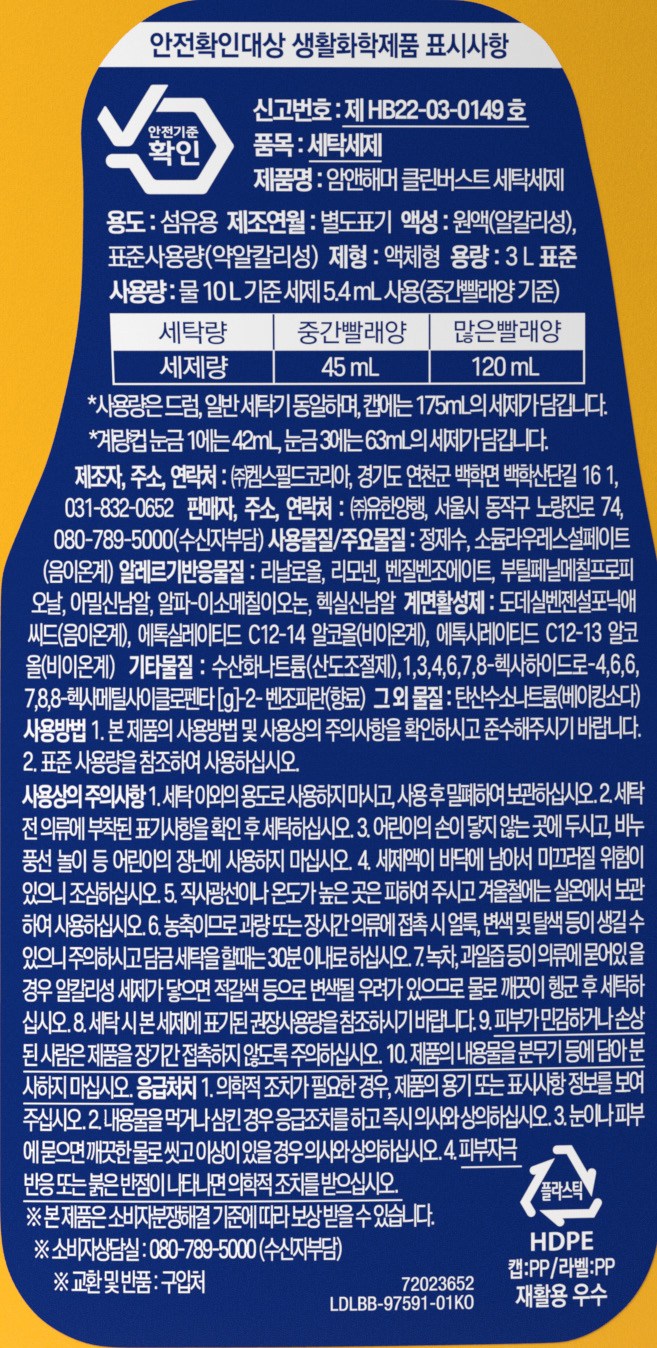| 품목 및 제품명 | 세탁세제 / 암앤해머 클린버스트 세탁세제 | 용도(표백제의 경우 계열을 함께표시) 및 제형 | 섬유용 / 액체형 |