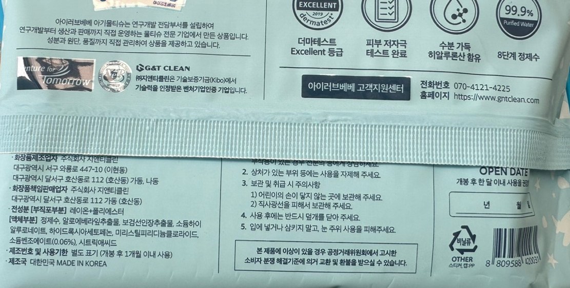 | 화장품제조업자, 화장품책임판매업자 및 맞춤형화장품판매업자 | (주)지앤티클린 / (주)지앤티클린 | 제조국 | 대한민국 |