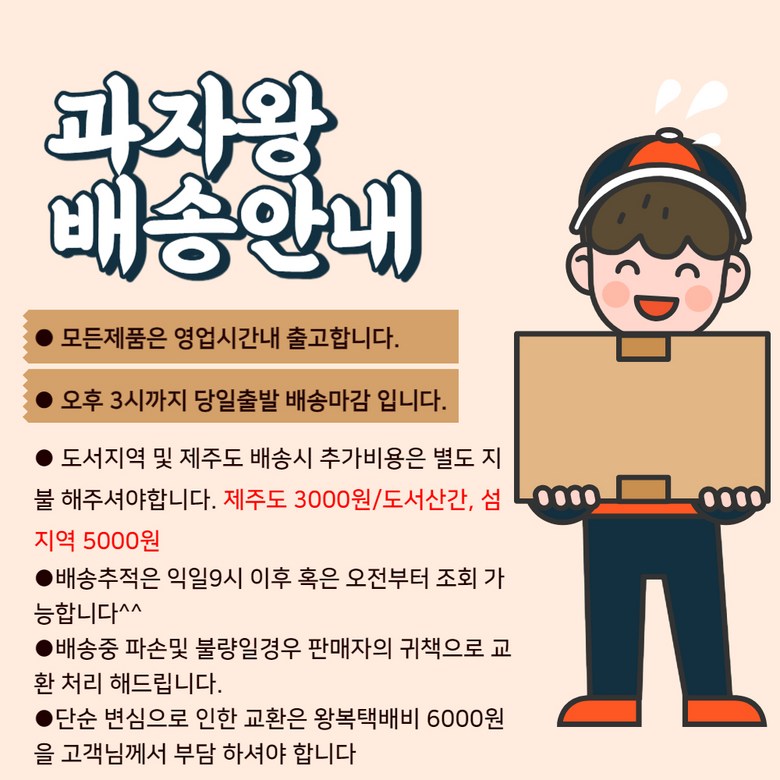 | 배송방법 | 순차배송 | 배송비 | 무료배송 · 도서산간 추가 배송비 - 제주 지역: 3,000원 - 도서산간 지역: 5,000원 |