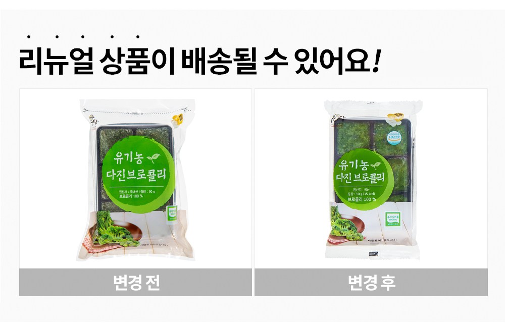 | 제품명 | 유기농 다진브로콜리 | 식품의 유형 | 과채가공품 (가열 후 섭취하는냉동식품) |