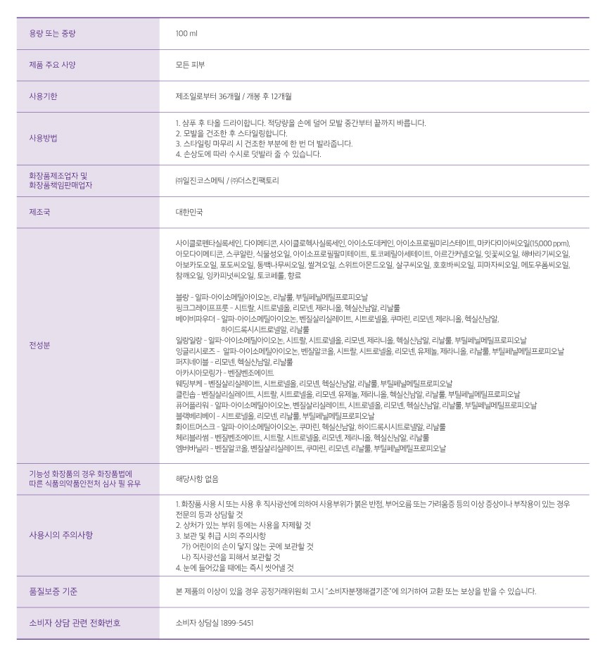 | 용량(중량) | 100ml * 2개 | 제품 주요 사양 | 모든 모발용 |