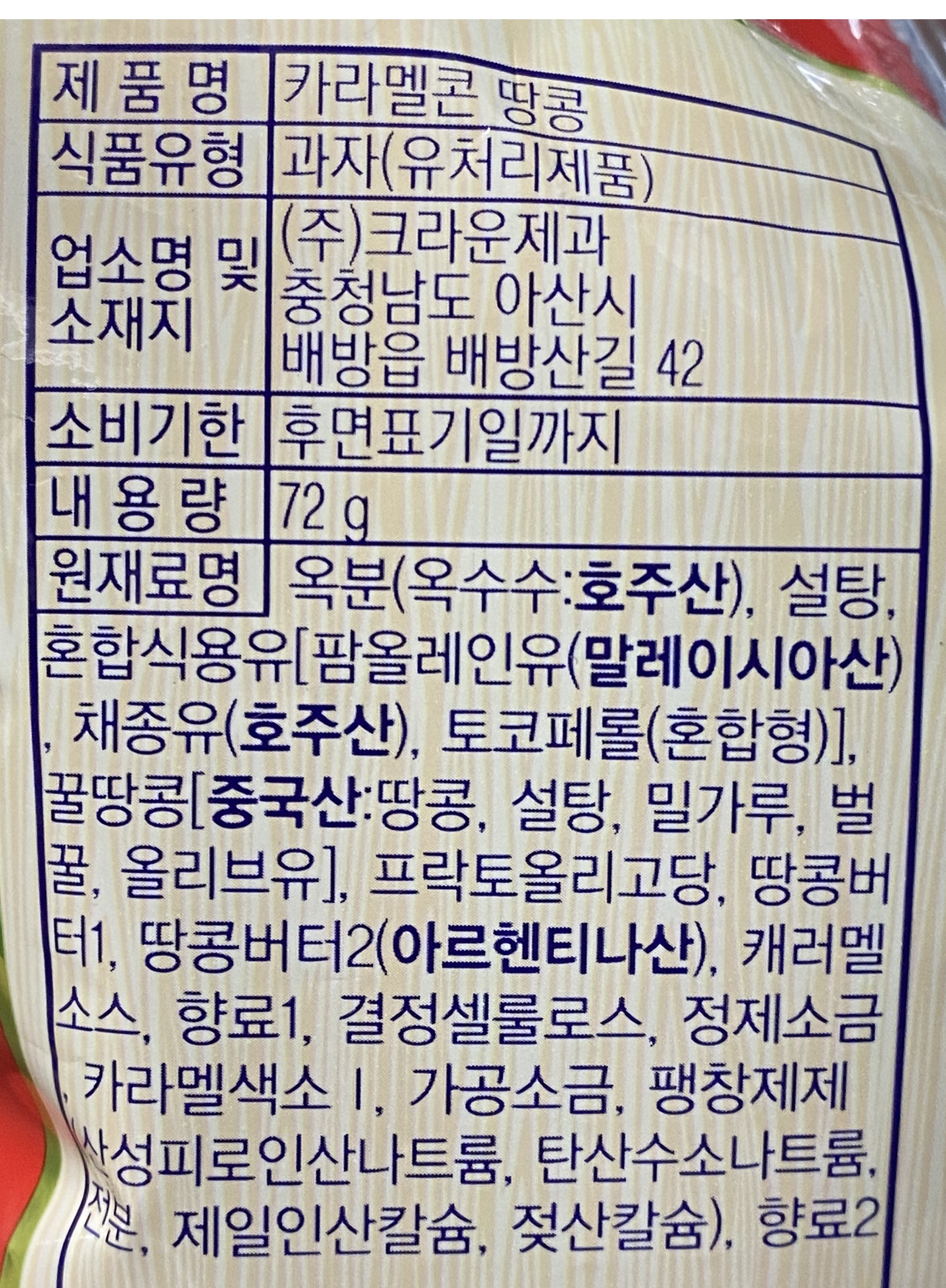 | 제품명 | 카라멜콘 땅콩카라멜콘 땅콩 | 식품의 유형 | 과자(유처리제품) |
