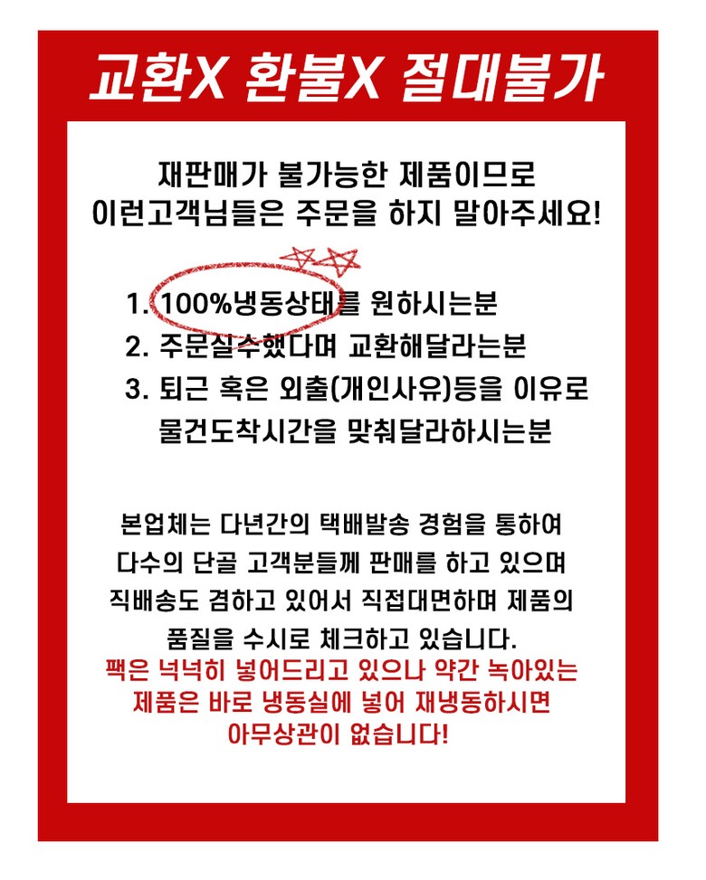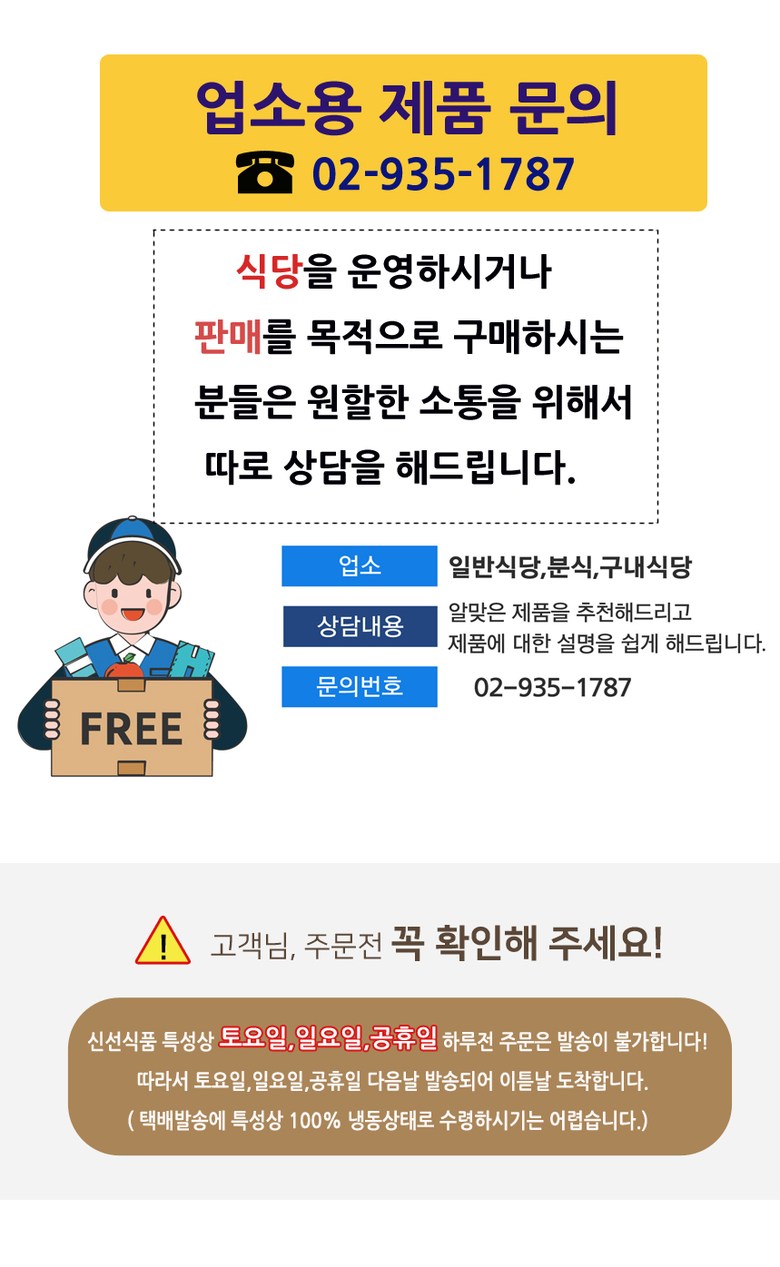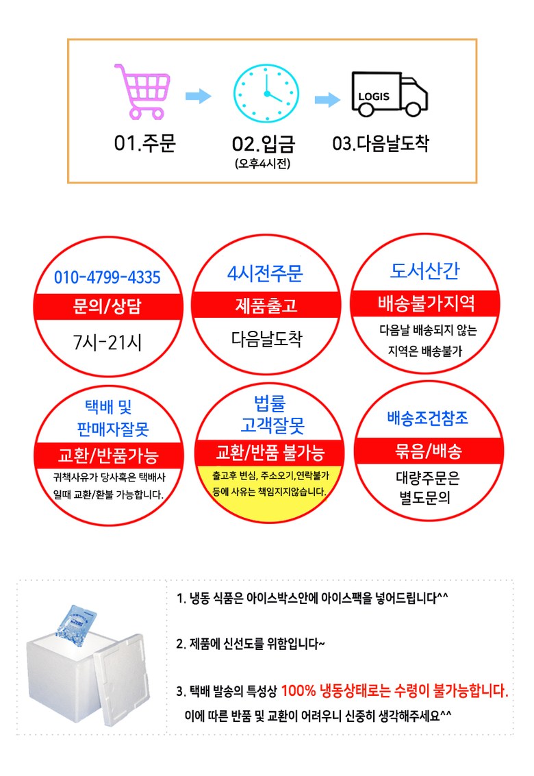 | 배송방법 | 신선/냉장/냉동 | 배송비 | 무료배송 - 도서산간 지역 배송불가 |