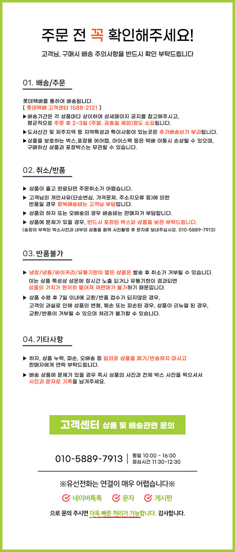 - 상품문의 및 후기게시판을 통해 취소나 환불, 반품 등은 처리되지 않습니다.